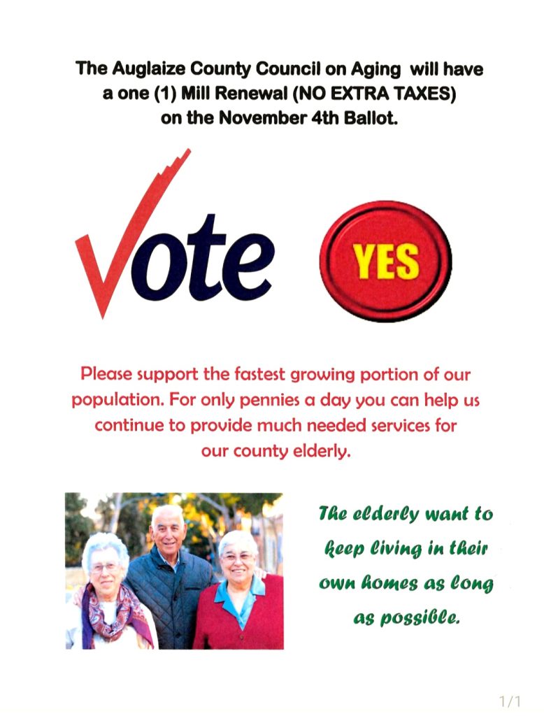 The Auglaize County Council on Aging, first mission is to assist the elderly, age 60+ of Auglaize County by providing direct services to promote the health, emotional, social and intellectual well-being of senior adults; by remaining independent and a resourceful part of the community.
